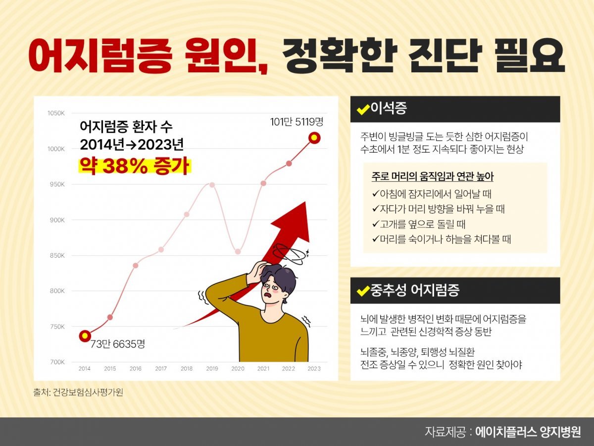건강보험심사평가원통계에 따르면 지난해 국내 어지럼증 환자는 101만5119명으로 10년 전인 2014년의 73만6635명 보다 약 38% 증가했다. 어지럼증은 스트레스나 수면부족 등을 겪는 남녀노소 누구에게나 발생할 수 있다.원인에 따라 다양한 양상을 보인다.