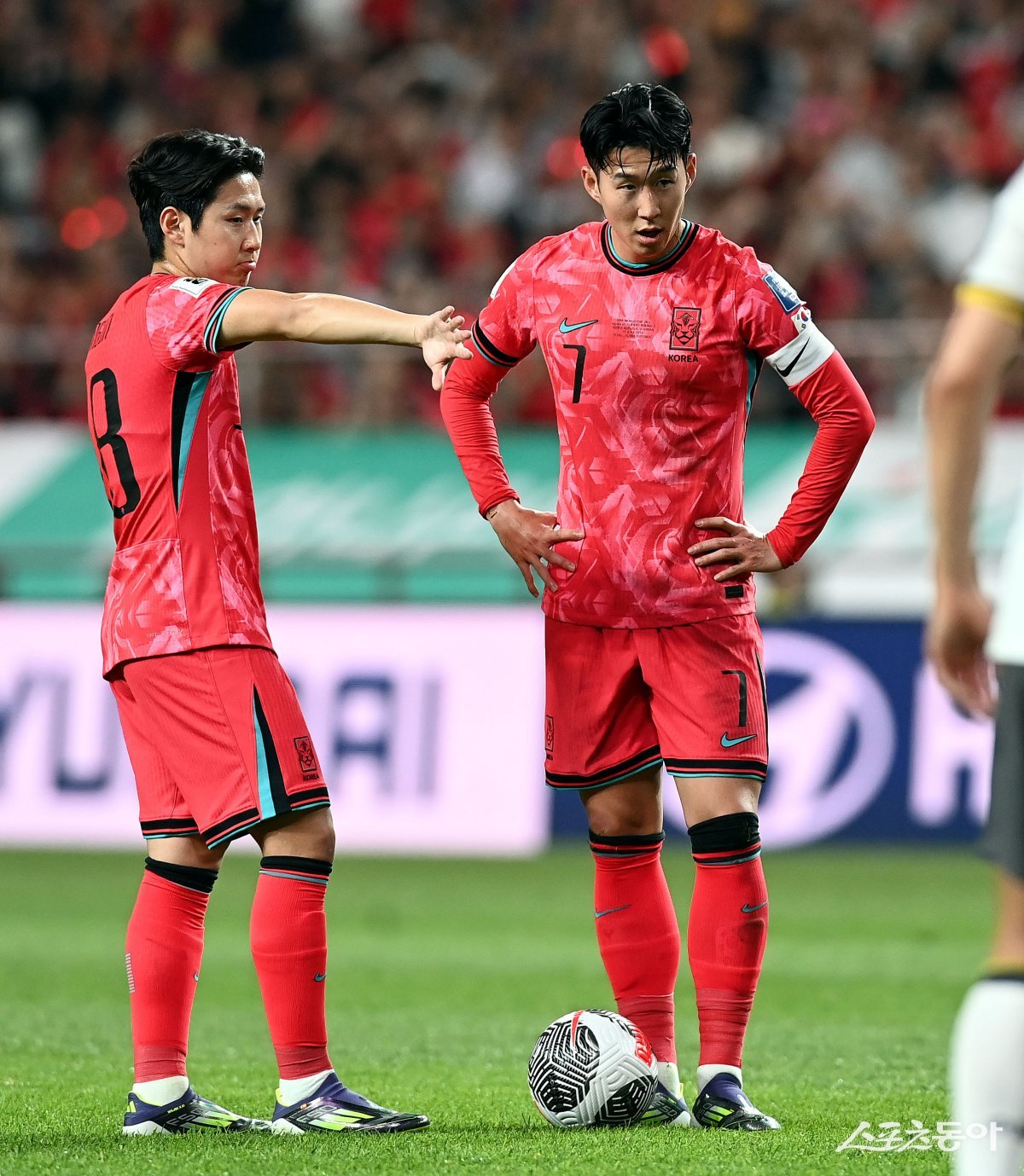 11일 서울 마포구 서울월드컵경기장에서 ‘2026 북중미 월드컵’ 아시아 2차예선 한국과 중국의 경기에서 한국 손흥민과 이강인이 프리킥을 준비하고 있다. 상암 | 김민성 기자 marineboy@donga.com
