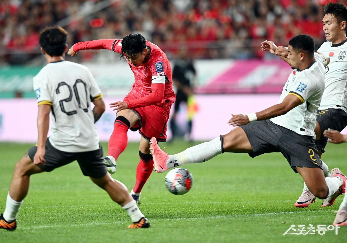 11일 서울 마포구 서울월드컵경기장에서 ‘2026 북중미 월드컵’ 아시아 2차예선 한국과 중국의 경기에서 한국 손흥민이 슛을 날리고 있다. 상암 | 김민성 기자 marineboy@donga.com