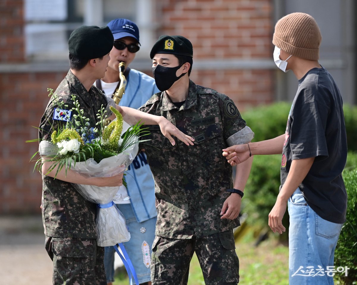 방탄소년단(BTS) 멤버 진이 12일 경기 연천 5보병사단 신병교육대대에서 전역식을 마친 후 지민과 인사하고 있다. 연천 | 주현희 기자 teth1147@donga.com
