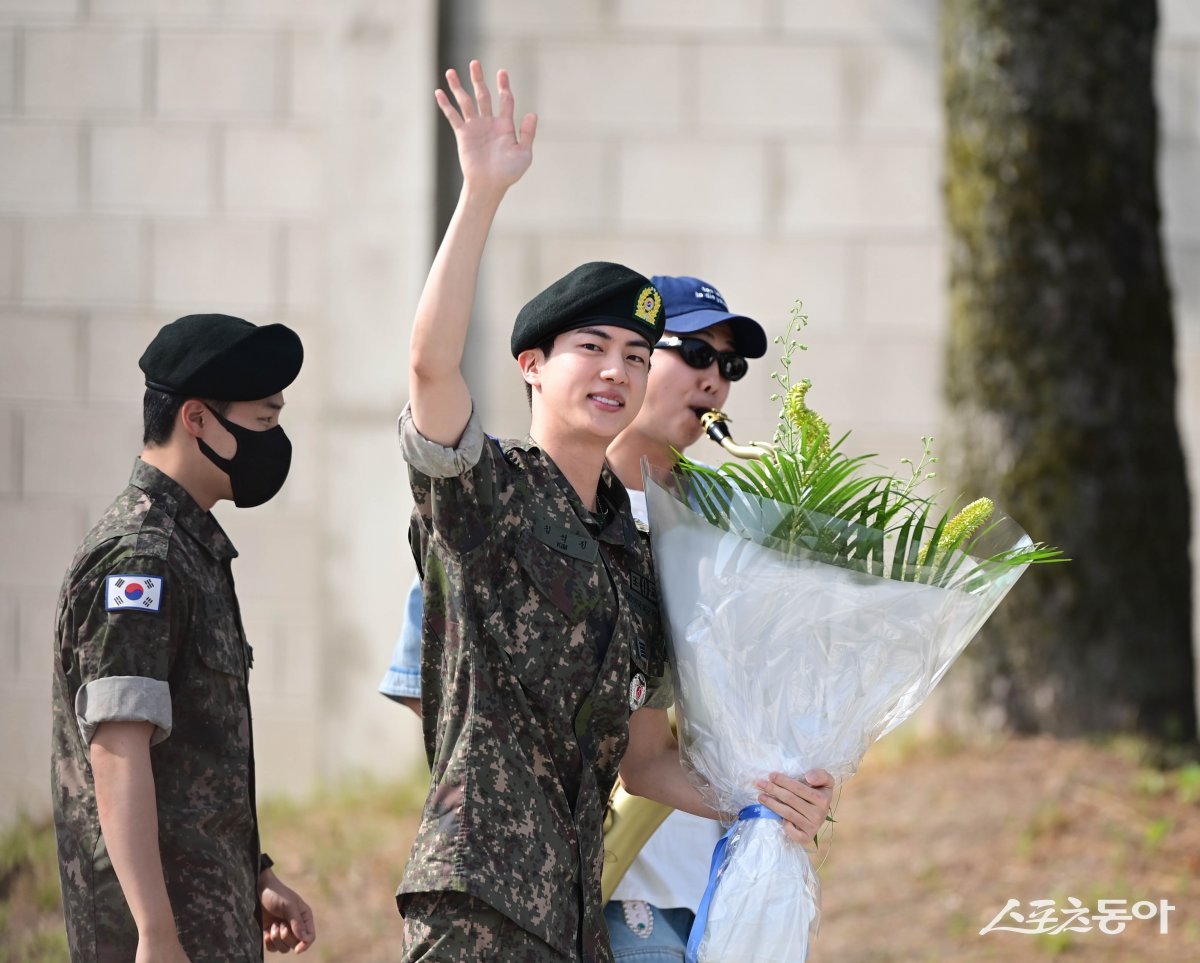 방탄소년단(BTS) 멤버 진이 12일 경기 연천 5보병사단 신병교육대대에서 전역식을 마친 후 취재진을 향해 인사하고 있다. 연천 | 주현희 기자 teth1147@donga.com