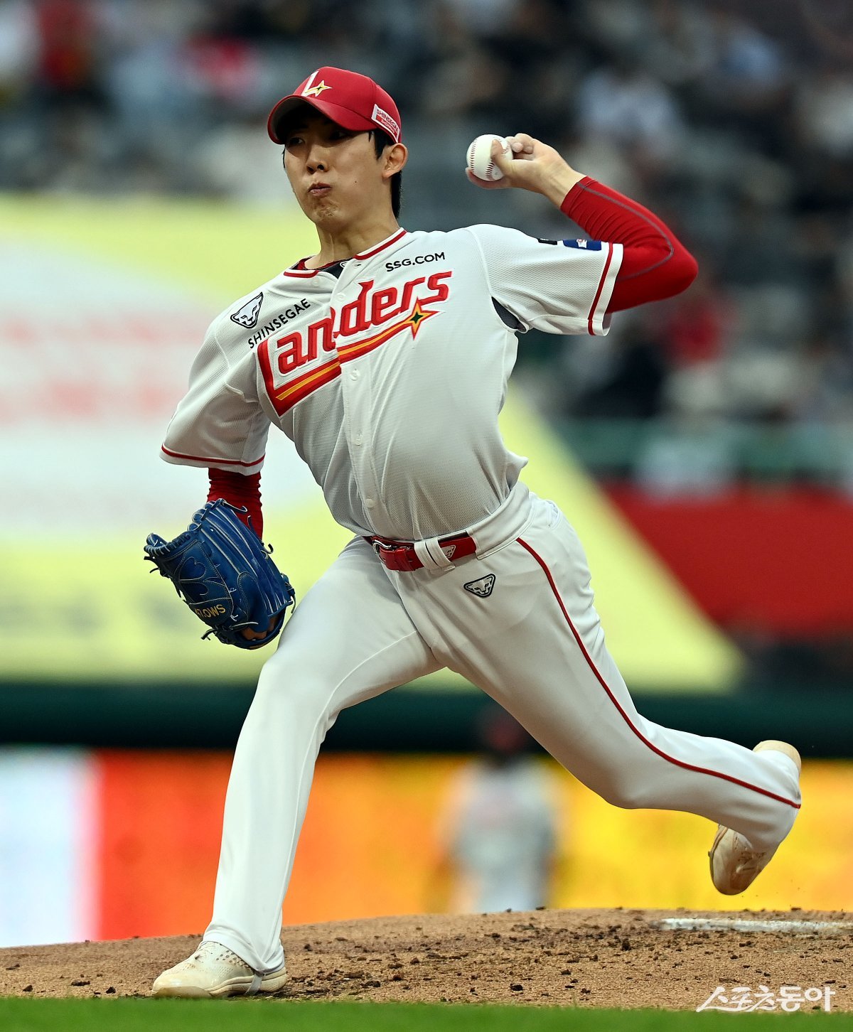 12일 인천 SSG 랜더스필드에서 ‘2024 신한 SOL 뱅크 KBO리그’ SSG 랜더스와 KIA 타이거즈의 경기가 열렸다. SSG 선발투수 오원석이 힘차게 볼을 던지고 있다. 인천 | 김민성 기자 marineboy@donga.com