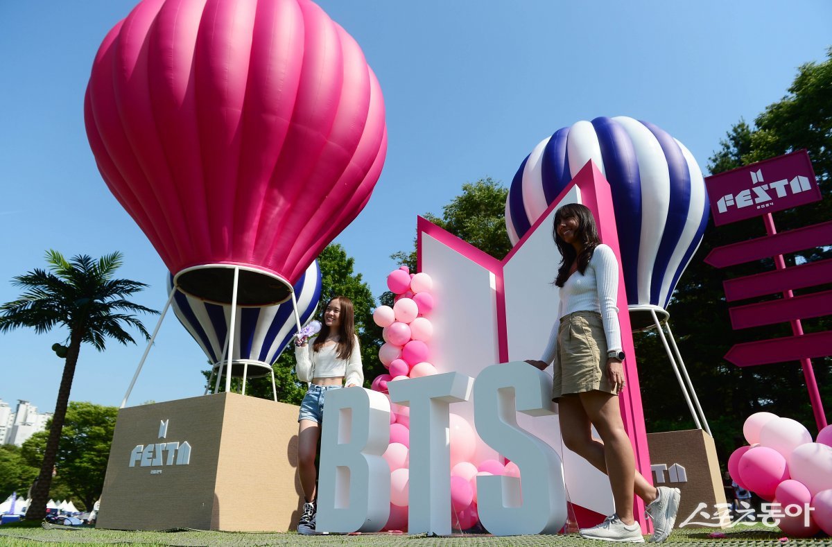 방탄소년단(BTS) 11주년 기념 그라운드 행사 ‘2024 페스타(2024 FESTA)’가 13일 서울 잠실종합운동장 일대에서 열리고 있다. 외국인 팬들이 기념 촬영을 하고 있다. 주현희 기자 teth1147@donga.com
