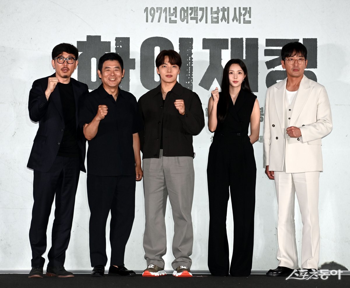13일 서울 용산CGV에서 열린 영화 ‘하이재킹’ 시사회에서 김성한 감독, 배우 성동일, 여진구, 채수빈, 하정우가 포토타임을 갖고 있다.