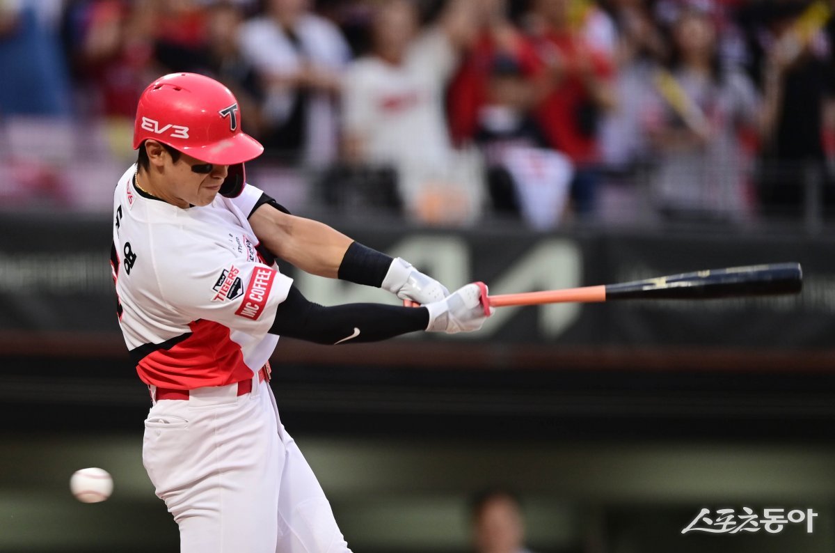 19일 광주기아챔피언스필드에서 열린 ‘2024 신한 SOL 뱅크 KBO리그’ LG 트윈스와 KIA 타이거즈의 경기에서 2회말 2사 만루 KIA 김도영이 헛스윙 삼진 아웃 당하고 있다. 광주 | 주현희 기자 teth1147@donga.com