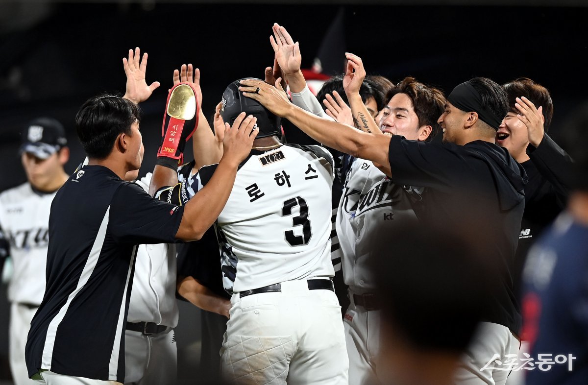 20일 경기도 수원 KT위즈파크에서 ‘2024 신한 SOL 뱅크 KBO리그’ KT 위즈와 롯데 자이언츠의 경기가 열렸다. KT가 9회말 1사 만루에서 끝내기 폭투로 승리한 후 선수들이 그라운드에서 기쁨을 나누고 있다. 수원 | 김민성 기자 marineboy@donga.com