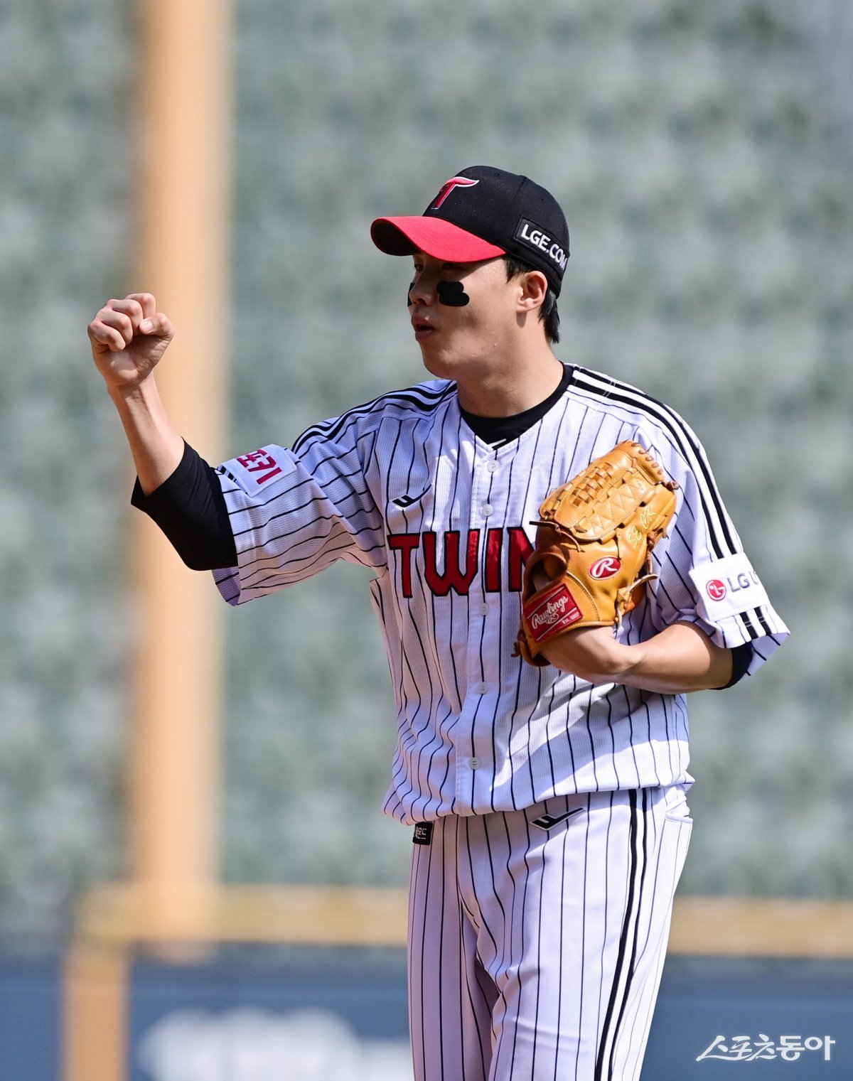 23일 서울 잠실야구장에서 열린 ‘2024 신한 SOL 뱅크 KBO리그’ KT 위즈와 LG 트윈스의 더블헤더 1차전 경기에서 5회초 1사 KT의 홈런성 타구가 잡히자 LG 선발 투수 임찬규가 주먹을 쥐고 있다. 잠실 | 주현희 기자 teth1147@donga.com