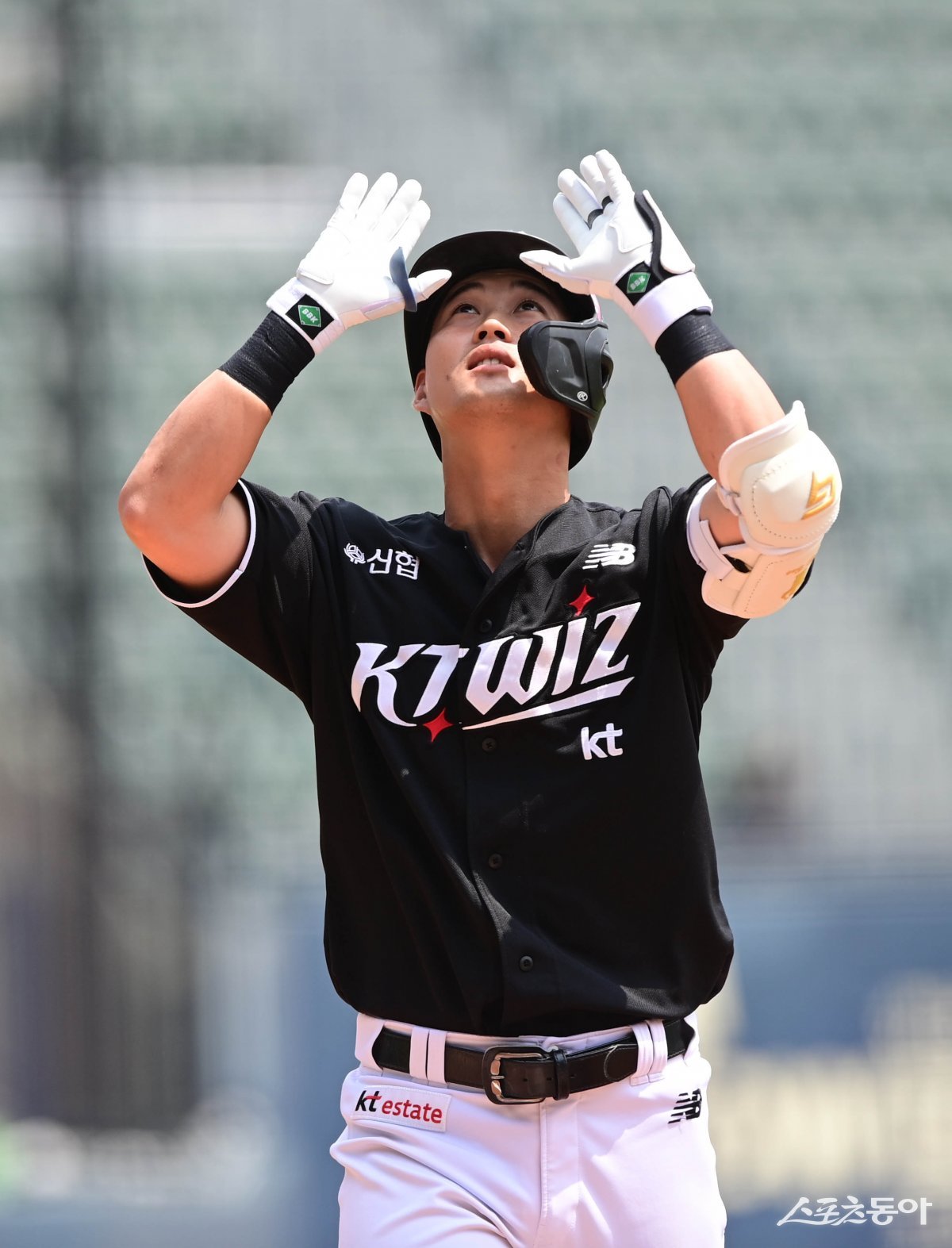 23일 서울 잠실야구장에서 열린 ‘2024 신한 SOL 뱅크 KBO리그’ KT 위즈와 LG 트윈스의 더블헤더 1차전 경기에서 1회초 1사 KT 배정대가 선제 좌월 솔로 홈런을 친 후 세리머니를 하고 있다. 잠실 | 주현희 기자 teth1147@donga.com