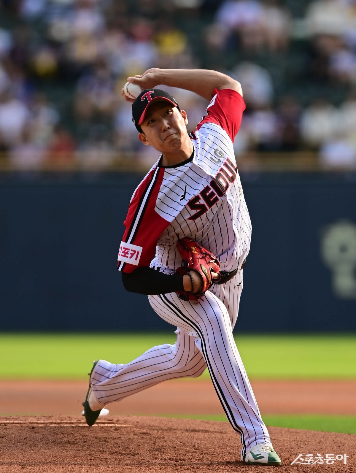 23일 서울 잠실야구장에서 열린 ‘2024 신한 SOL 뱅크 KBO리그’ KT 위즈와 LG 트윈스의 더블헤더 2차전 경기에서 LG 선발 투수 손주영이 마운드에 올라 역투하고 있다. 잠실 | 주현희 기자 teth1147@donga.com