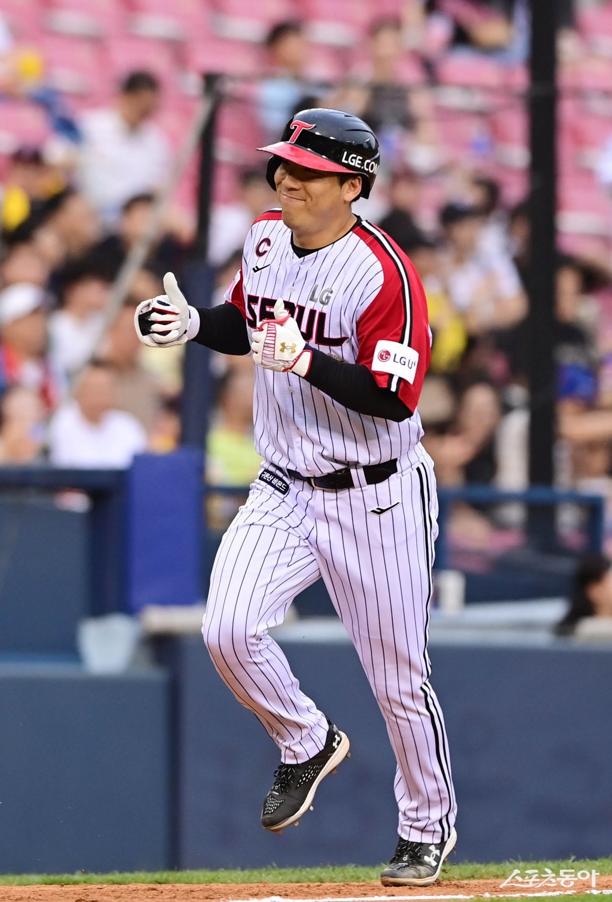 23일 서울 잠실야구장에서 열린 ‘2024 신한 SOL 뱅크 KBO리그’ KT 위즈와 LG 트윈스의 더블헤더 2차전 경기에서 3회말 1사 1루 LG 김현수가 우월 2점홈런을 친 후 세리머니를 하고 있다. 잠실 | 주현희 기자 teth1147@donga.com