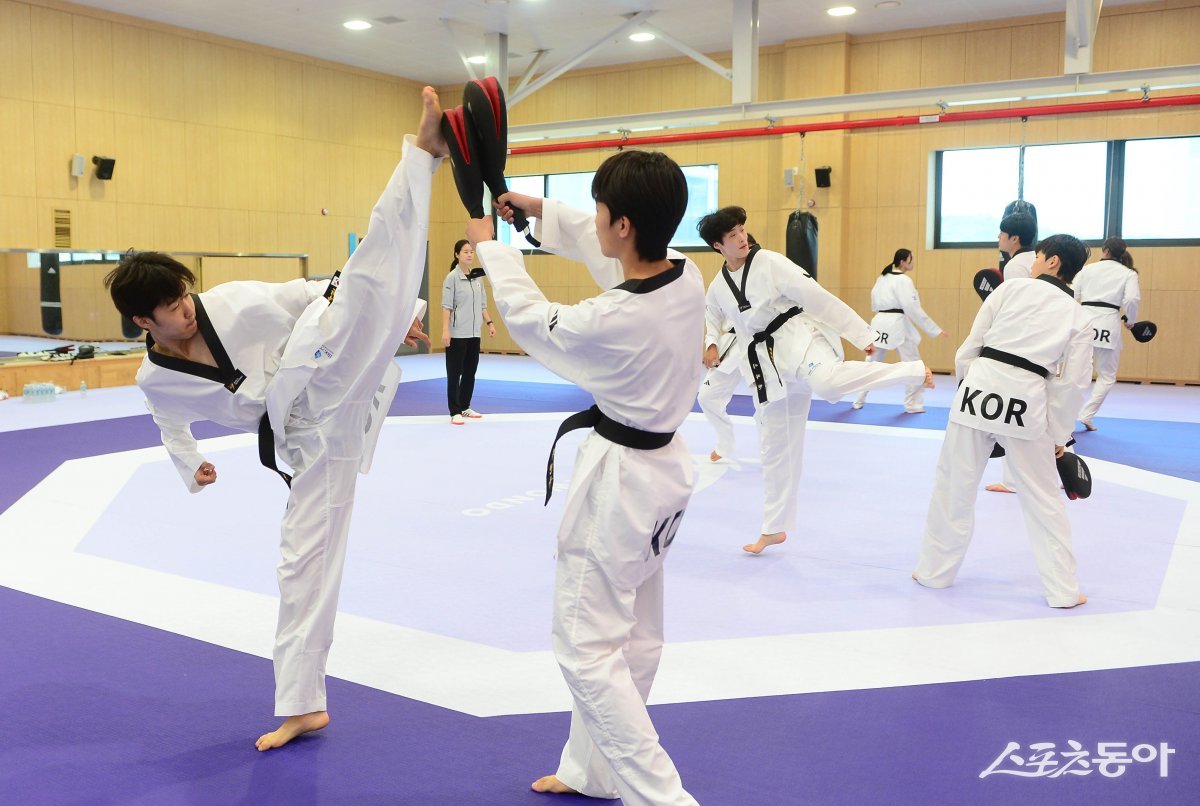 25일 충북 진천국가대표선수촌에서 열린 ‘2024 파리올림픽 태권도 미디어데이’에서 한국 태권도국가대표팀 선수들이 훈련을 하고 있다. 진천 | 주현희 기자 teth1147@donga.com