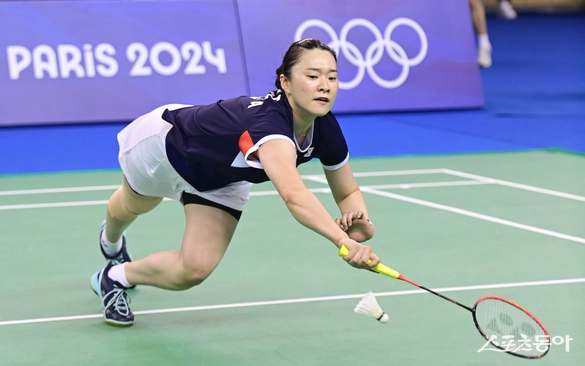 25일 충북 진천국가대표선수촌에서 열린 ‘2024 파리올림픽 배드민턴 미디어데이’ 스페셜매치 2차전에서 한국 배드민턴 대표팀 김가은이 실점하고 있다. 진천 | 주현희 기자 teth1147@donga.com