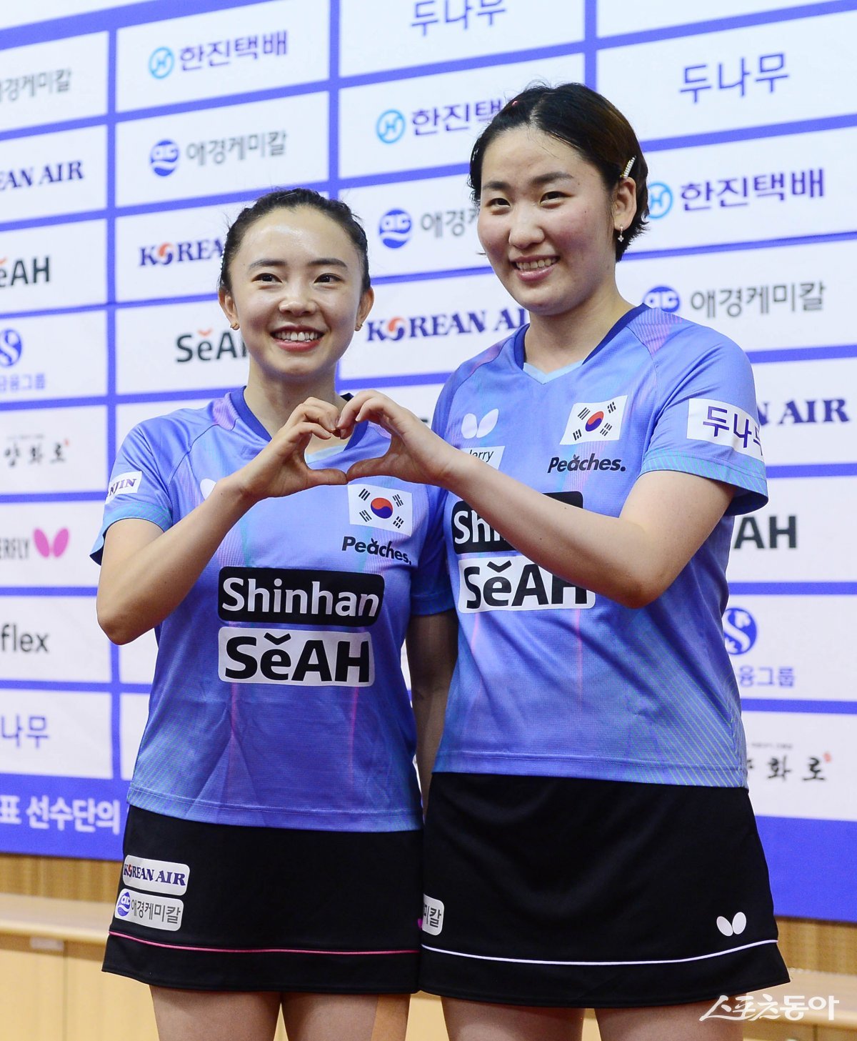 25일 충북 진천국가대표선수촌에서 열린 ‘2024 파리올림픽 탁구 미디어데이’에서 한국 탁구 대표팀 전지희, 이은혜가 포즈를 취하고 있다. 진천 | 주현희 기자 teth1147@donga.com