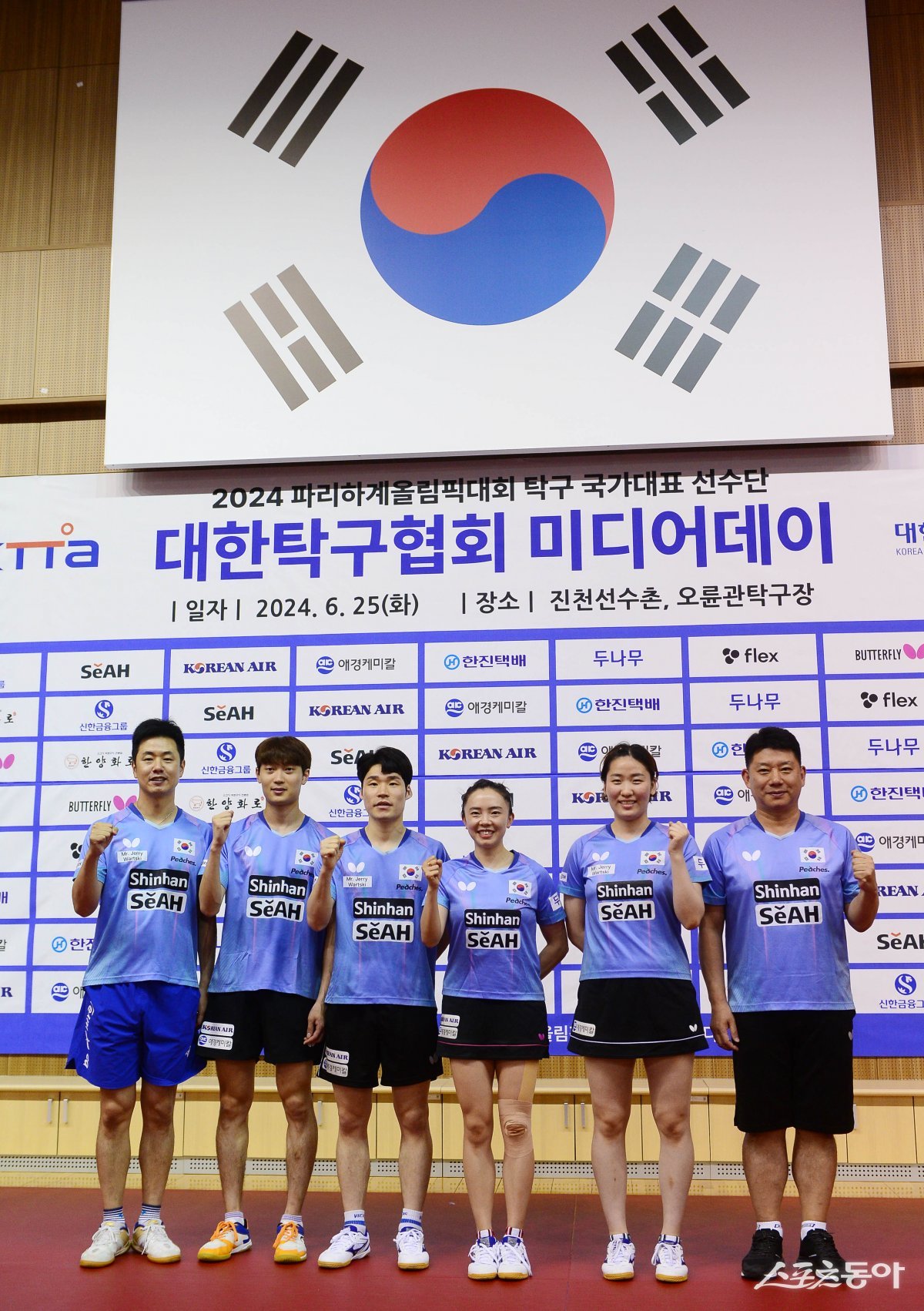 25일 충북 진천국가대표선수촌에서 열린 ‘2024 파리올림픽 탁구 미디어데이’에서 한국 탁구 대표팀 주세혁 감독, 조대성, 장우진, 전지희, 이은혜, 오광헌 감독이 포즈를 취하고 있다. 진천 | 주현희 기자 teth1147@donga.com