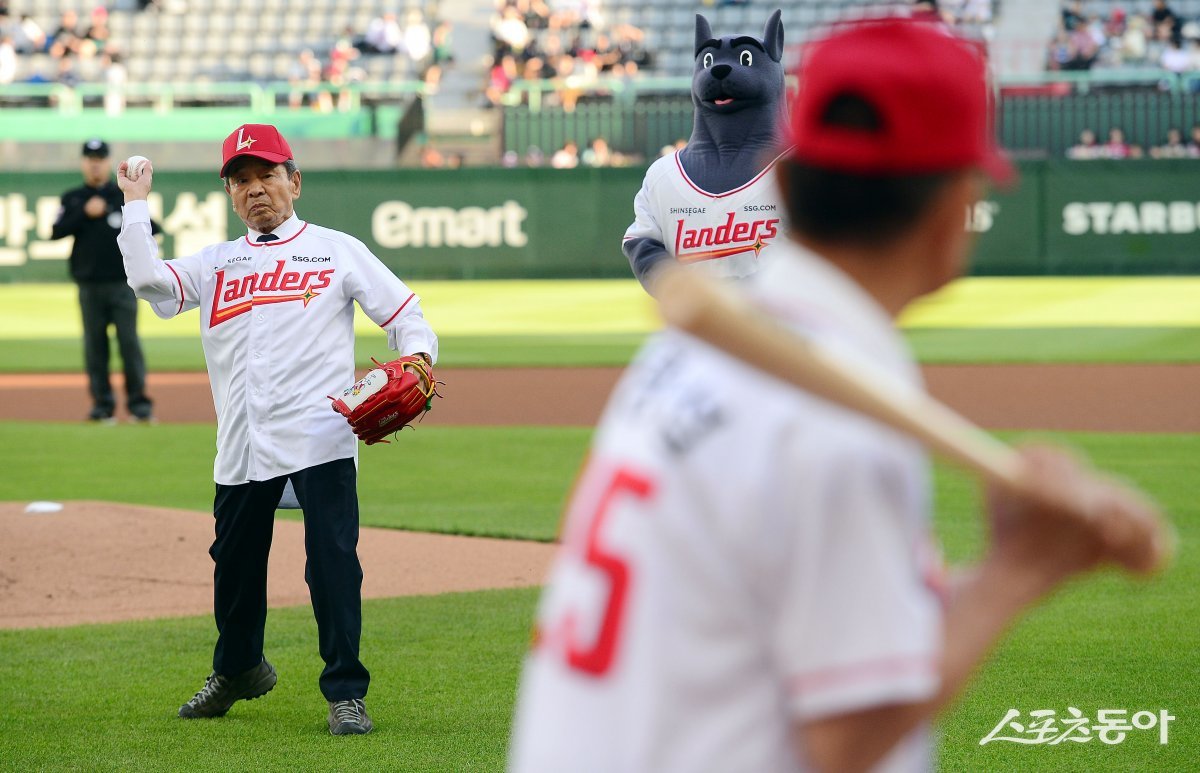 25일 인천 SSG 랜더스필드에서 ‘2024 신한 SOL 뱅크 KBO리그’ SSG 랜더스와 KT 위즈의 경기가 열렸다. 경기 전 강용희, 이명섭 6.25 참전용사가 시구, 시타를 펼치고 있다. 인천 | 김민성 기자 marineboy@donga.com