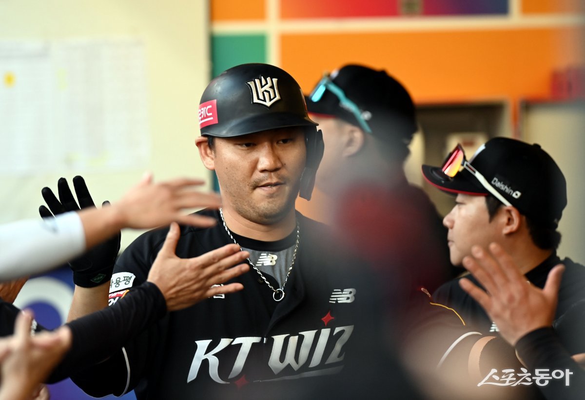 25일 인천 SSG 랜더스필드에서 ‘2024 신한 SOL 뱅크 KBO리그’ SSG 랜더스와 KT 위즈의 경기가 열렸다. 3회초 2사 1, 3루에서 KT 장성우가 스리런 홈런을 쏘아 올린 후 동료들의 환영을 받고 있다. 인천 | 김민성 기자 marineboy@donga.com