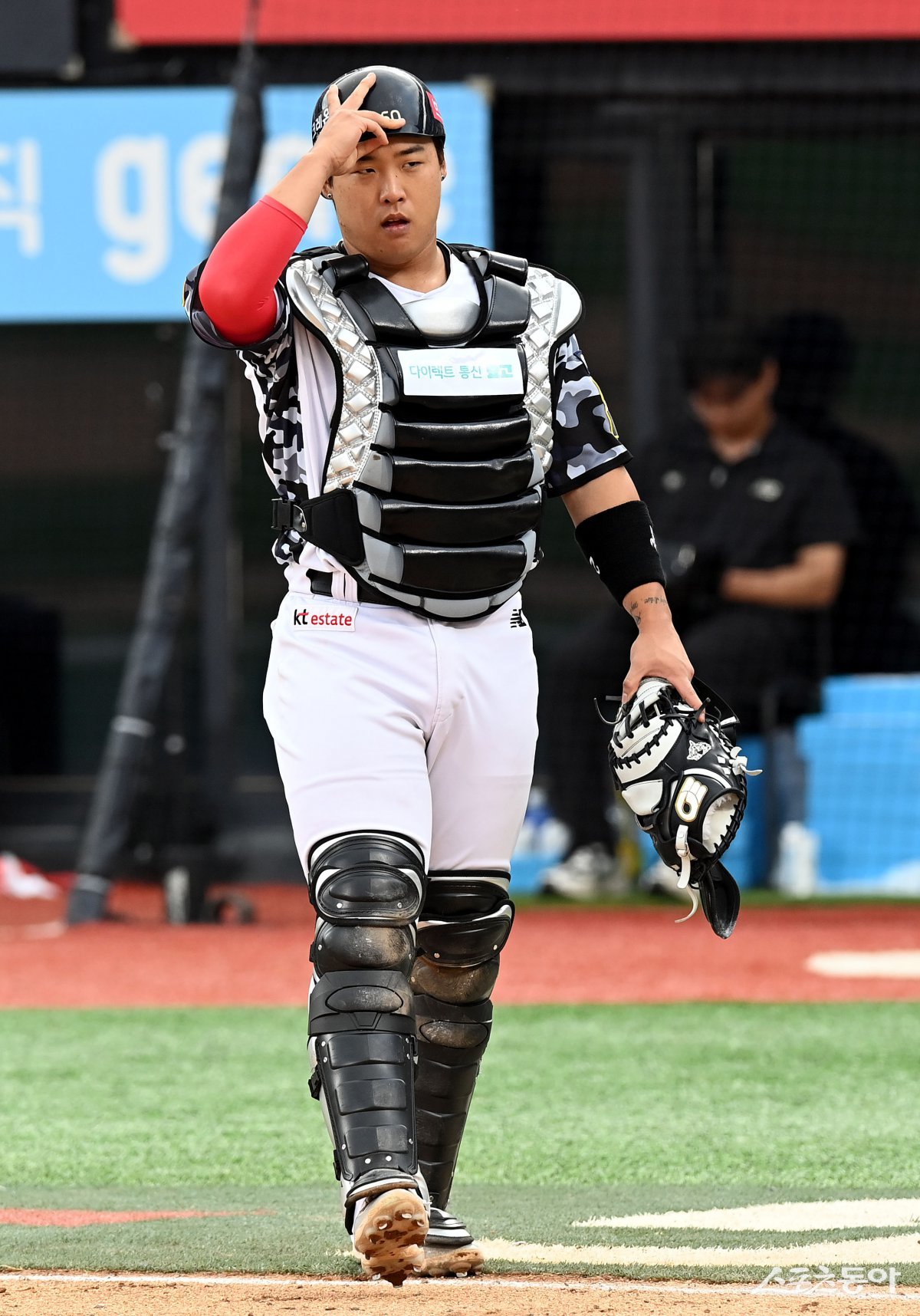 30일 경기도 수원 KT위즈파크에서 ‘2024 신한 SOL 뱅크 KBO리그’ KT 위즈와 삼성 라이온즈의 DH 2차전 경기가 열렸다. KT 강백호가 포수로 선발 출전하고 있다. 수원 | 김민성 기자 marineboy@donga.com