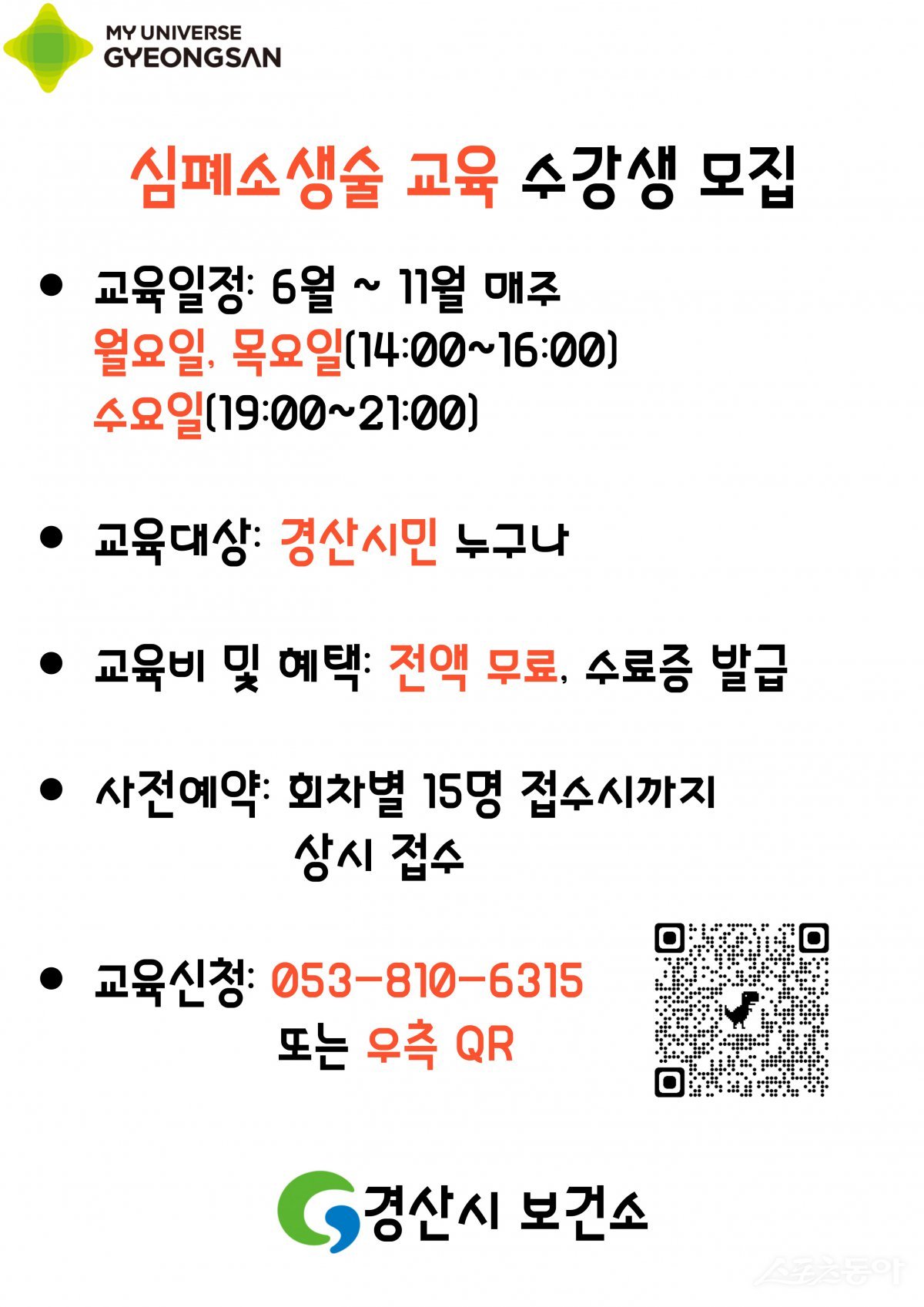 경산시보건소에서 실시 중인 심폐소생술 교육은 회차당 15명까지 선착순으로 전화 또는 큐알(QR) 코드를 이용해 예약할 수 있다.