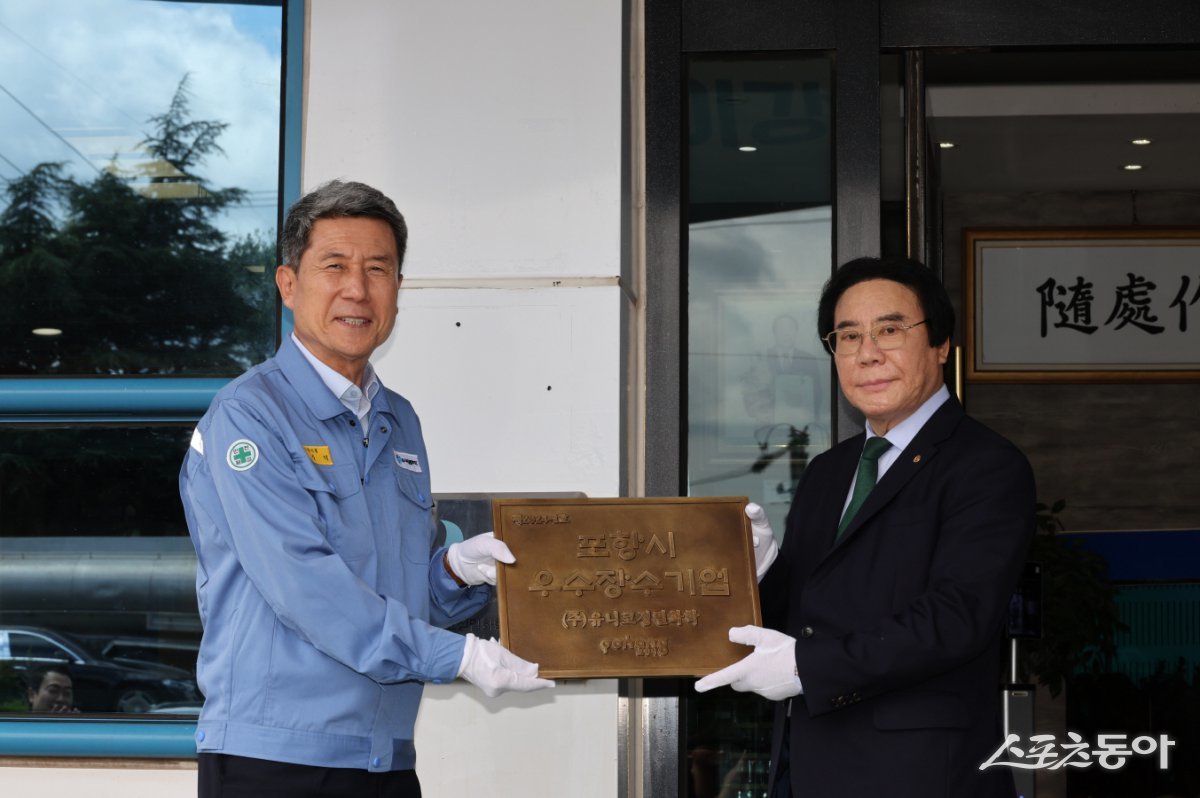 이강덕 포항시장은 3일 제1회 우수장수기업으로 선정된 ㈜유니코정밀화학(대표 송방차랑)을 방문해 현판을 전달하고 현장 근로자들을 격려했다.