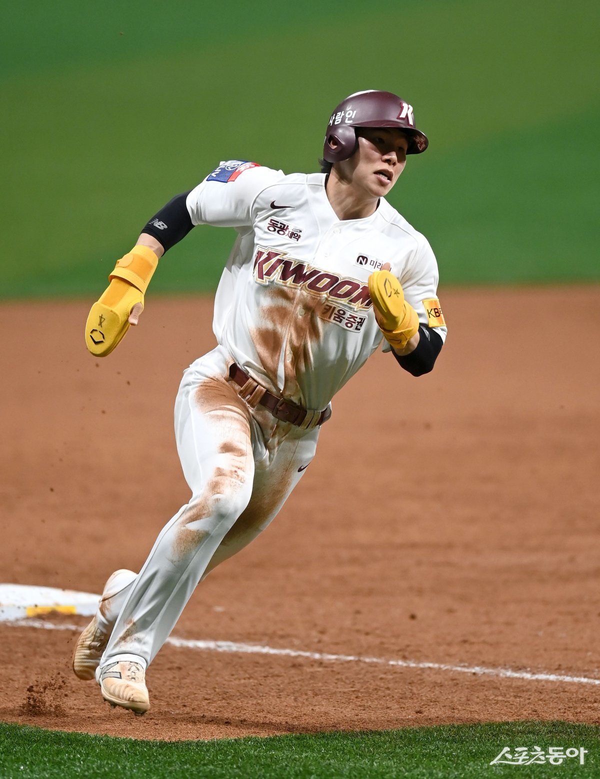 3일 서울 고척스카이돔에서 ‘2024 신한은행 SOL뱅크 KBO리그’ LG 트윈스와 키움 히어로즈 경기가 열렸다. 3회말 1사 2루 키움 안타 때 2루주자 김혜성이 홈까지 달려 득점에 성공하고 있다. 고척 | 김종원 기자 won@donga.com