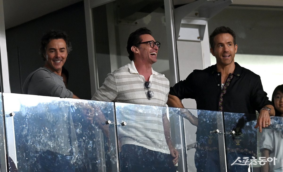 3일 서울 고척스카이돔에서 ‘2024 신한은행 SOL뱅크 KBO리그’ LG 트윈스와 키움 히어로즈 경기가 열렸다. 영화 데드폴과 울버린‘ 숀 레비 감독과 휴 잭맨, 라이언 레이놀즈가 관전을 하고 있다. 고척 | 김종원 기자 won@donga.com