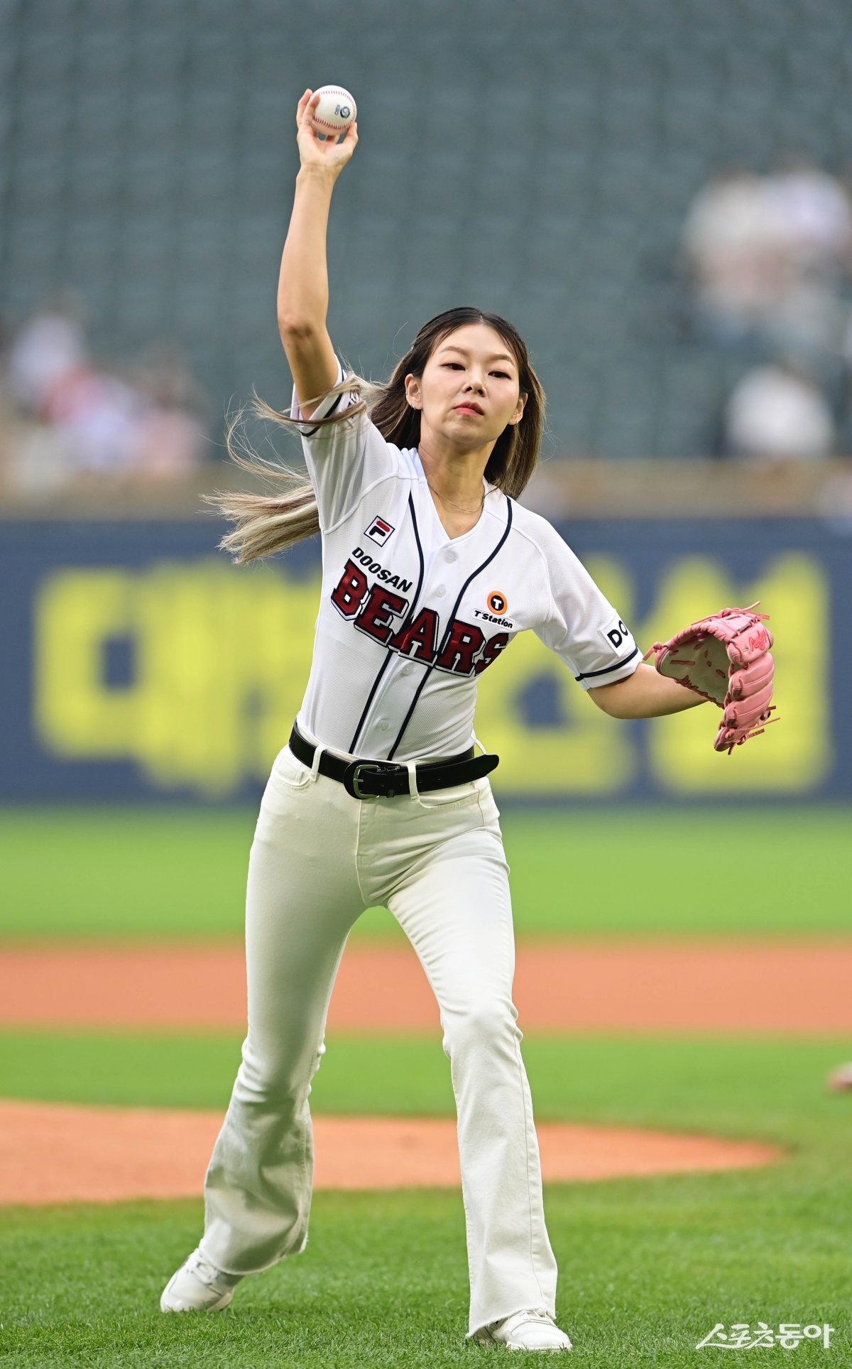 3일 서울 잠실야구장에서 열린 ‘2024 신한 SOL 뱅크 KBO리그’ 롯데 자이언츠와 두산 베어스의 경기에 앞서 모델 겸 방송인 송해나가 시구를 하고 있다. 잠실 | 주현희 기자 teth1147@donga.com
