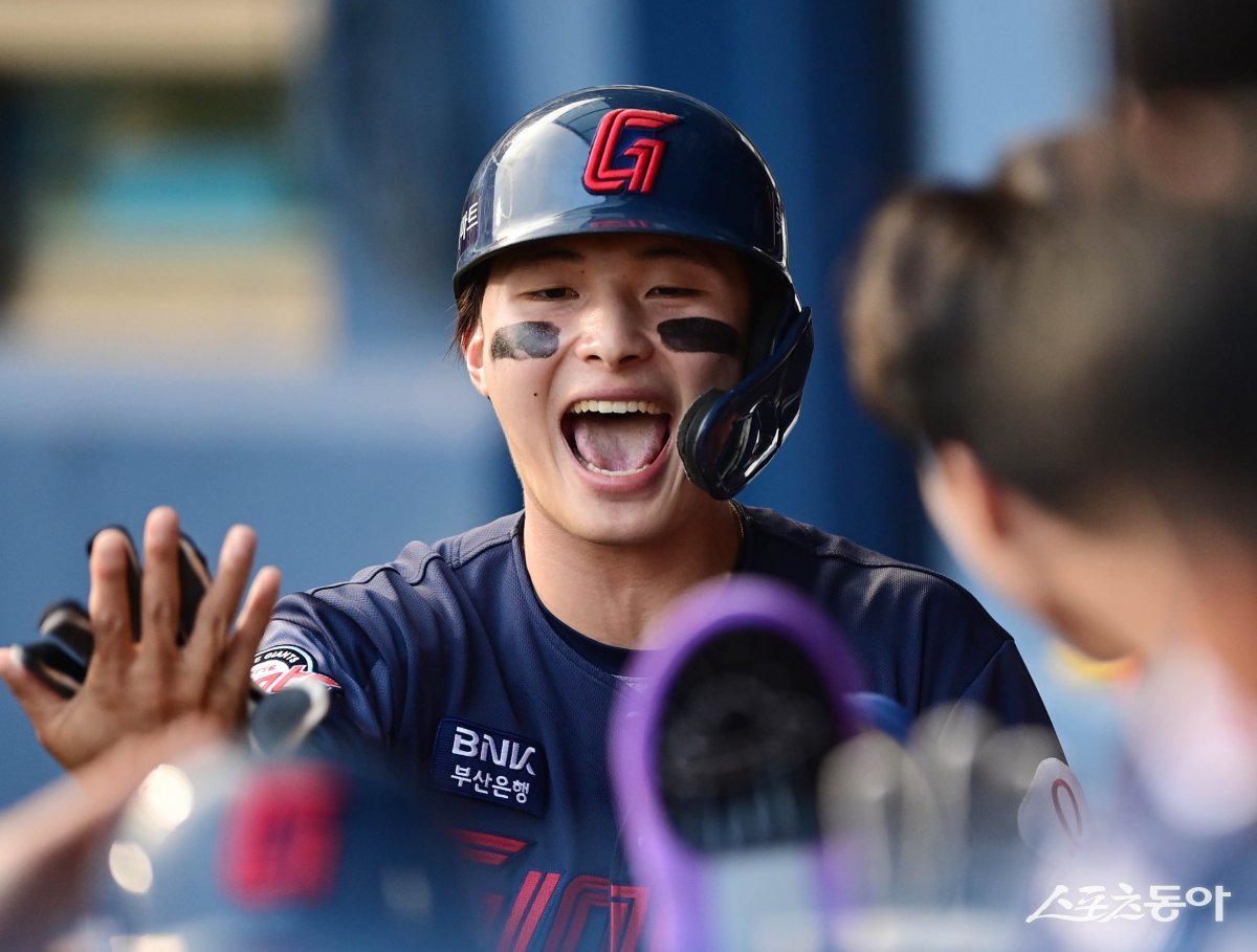 3일 서울 잠실야구장에서 열린 ‘2024 신한 SOL 뱅크 KBO리그’ 롯데 자이언츠와 두산 베어스의 경기에서 2회초 2사 만루 롯데의 2루타 때 득점에 성공한 1루주자 윤동희가 더그아웃에서 동료들과 기쁨을 나누고 있다. 잠실 | 주현희 기자 teth1147@donga.com