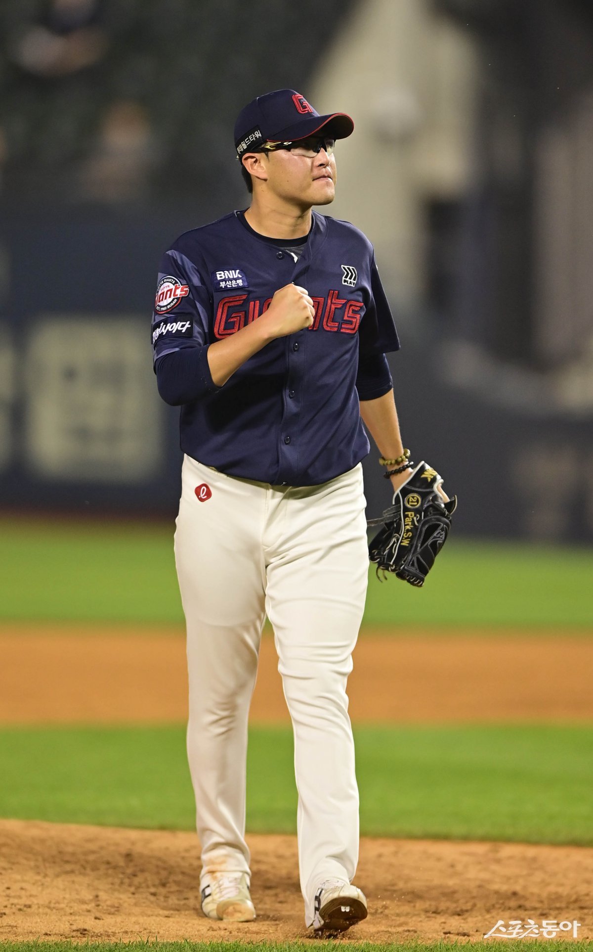 3일 서울 잠실야구장에서 열린 ‘2024 신한 SOL 뱅크 KBO리그’ 롯데 자이언츠와 두산 베어스의 경기에서 4회말 무실점으로 수비를 마친 롯데 박세웅이 기뻐하고 있다. 잠실 | 주현희 기자 teth1147@donga.com