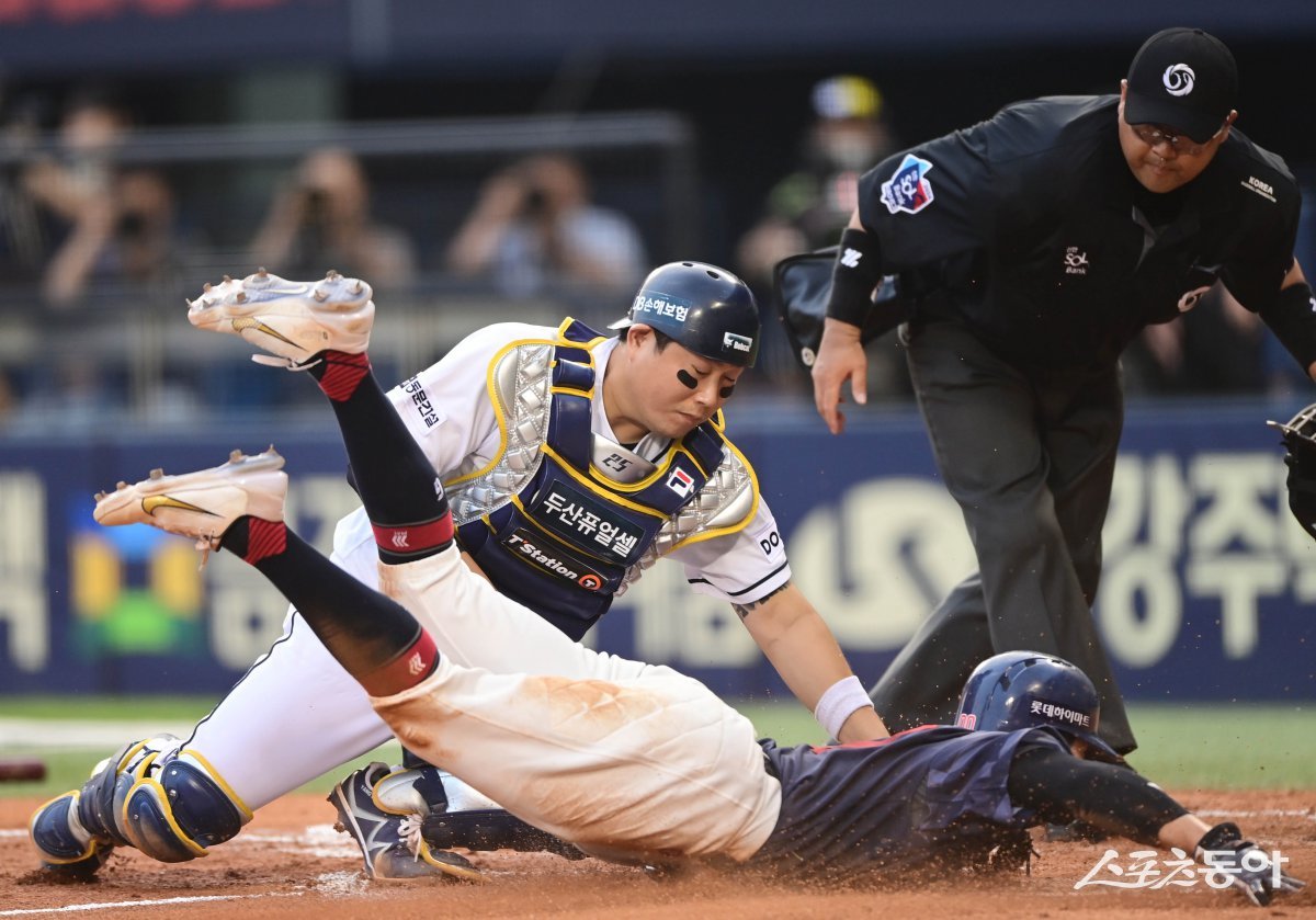 3일 서울 잠실야구장에서 열린 ‘2024 신한 SOL 뱅크 KBO리그’ 롯데 자이언츠와 두산 베어스의 경기에서 2회초 1사 1, 3루 롯데의 땅볼 때 두산 포수 양의지가 3루주자를 태그 아웃시키고 있다. 잠실 | 주현희 기자 teth1147@donga.com