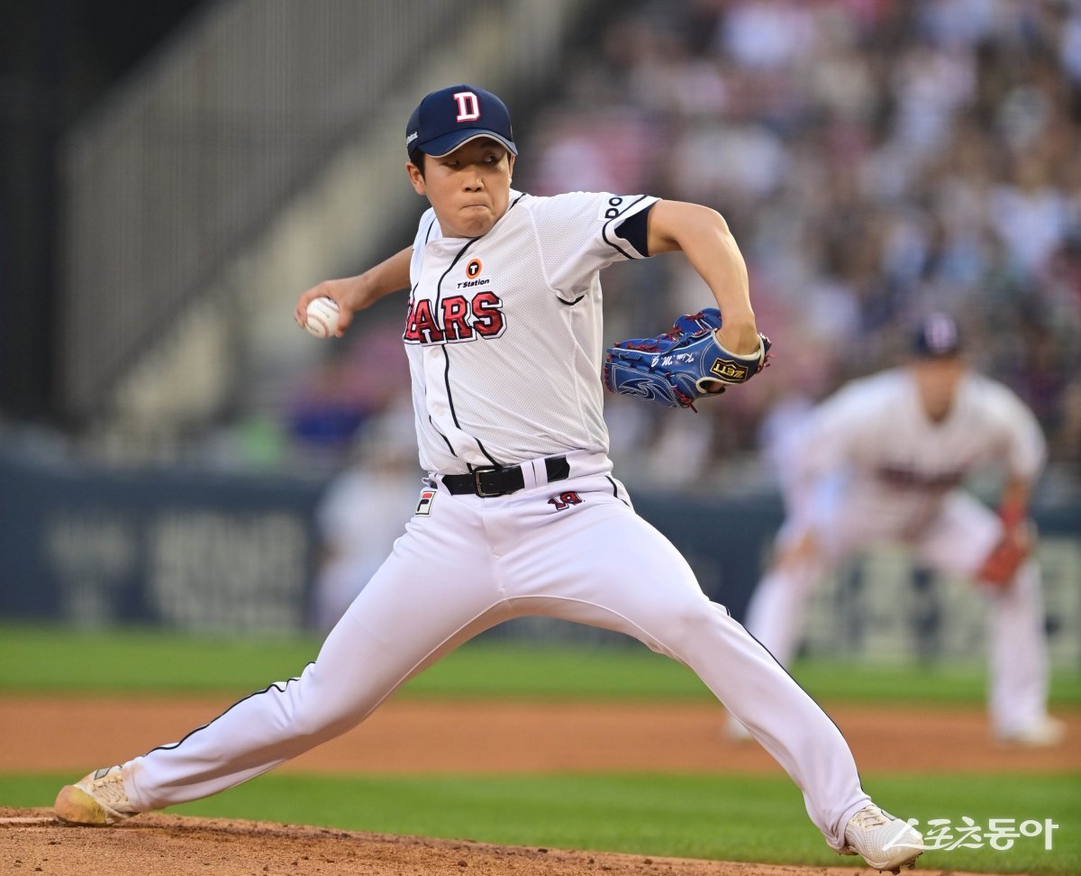 3일 서울 잠실야구장에서 열린 ‘2024 신한 SOL 뱅크 KBO리그’ 롯데 자이언츠와 두산 베어스의 경기에서 3회초 두산 김민규가 교체로 마운드에 올라 역투하고 있다. 잠실 | 주현희 기자 teth1147@donga.com