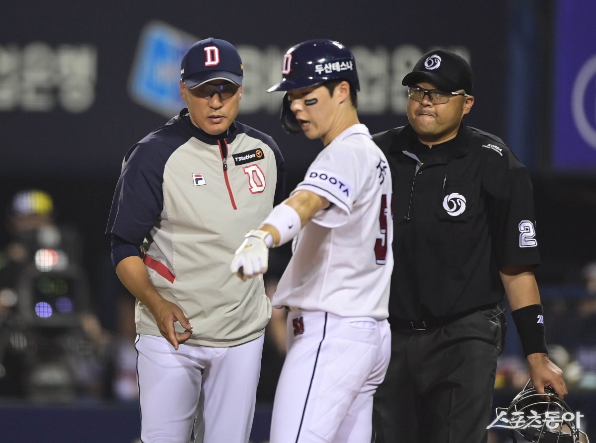 3일 서울 잠실야구장에서 열린 ‘2024 신한 SOL 뱅크 KBO리그’ 롯데 자이언츠와 두산 베어스의 경기에서 6회말 무사 두산 조수행의 땅볼 아웃 처리 때 두산 이승엽 감독이 파울 여부를 확인하고 있다. 잠실 | 주현희 기자 teth1147@donga.com