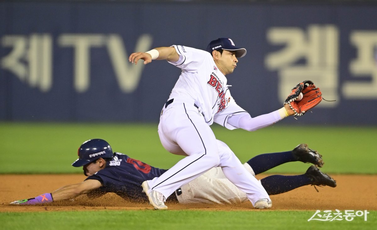 3일 서울 잠실야구장에서 열린 ‘2024 신한 SOL 뱅크 KBO리그’ 롯데 자이언츠와 두산 베어스의 경기에서 7회초 2사 1루 상황에서 두산 강승호가 롯데 1루주자 황성빈에게 도루를 허용하고 있다. 잠실 | 주현희 기자 teth1147@donga.com