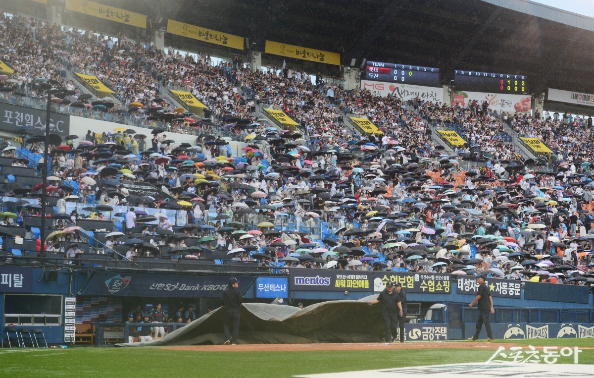 4일 서울 잠실야구장에서 열린 ‘2024 신한 SOL 뱅크 KBO리그’ 롯데 자이언츠와 두산 베어스의 경기에서 3회초 2사 1, 2루 상황에서 우천에 그라운드 관리인들이 방수포를 덮고 있다. 잠실 | 주현희 기자 teth1147@donga.com