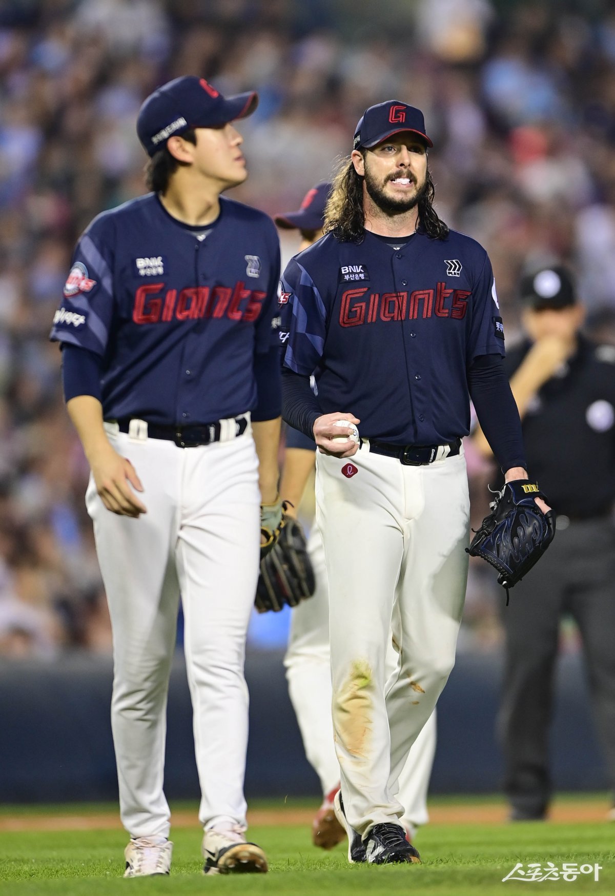 4일 서울 잠실야구장에서 열린 ‘2024 신한 SOL 뱅크 KBO리그’ 롯데 자이언츠와 두산 베어스의 경기에서 5회말 무사 1, 2루 두산에 번트 안타를 허용한 롯데 윌커슨이 아쉬워하고 있다. 잠실 | 주현희 기자 teth1147@donga.com