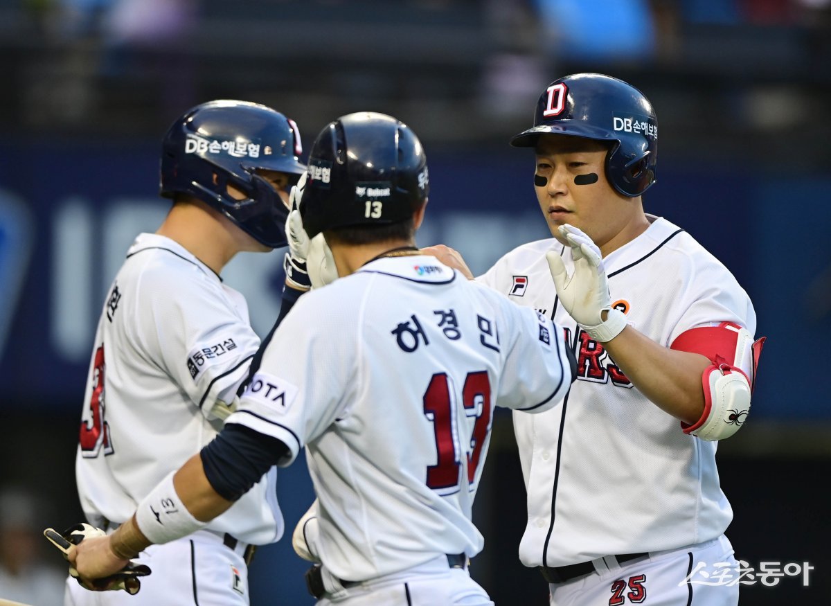 4일 서울 잠실야구장에서 열린 ‘2024 신한 SOL 뱅크 KBO리그’ 롯데 자이언츠와 두산 베어스의 경기에서 4회말 1사 1루 두산 양의지가 좌월 선제 2점 홈런을 친 후 동료들의 축하를 받고 있다. 잠실 | 주현희 기자 teth1147@donga.com