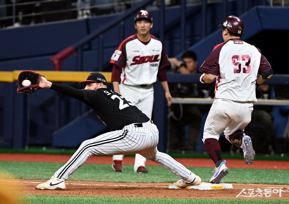 4일 서울 고척스카이돔에서 ‘2024 신한 SOL 뱅크 KBO리그’ 키움 히어로즈와 LG 트윈스의 경기가 열렸다. 8회말 1사 만루에서 내야땅볼 때 키움 최주환이 1루에서 세이프되고 있다. 고척 | 김민성 기자 marineboy@donga.com