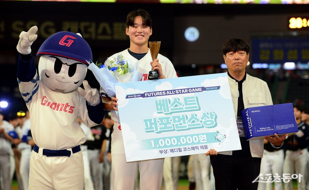5일 인천 SSG랜더스필드에서 ‘2024 신한 SOL Bank KBO 올스타 프라이데이’ 경기가 열렸다. 경기 종료 후 박준우가 베스트 퍼포먼스상을 수상 후 기념찰영을 하고 있다. 인천 | 김민성 기자 marineboy@donga.com