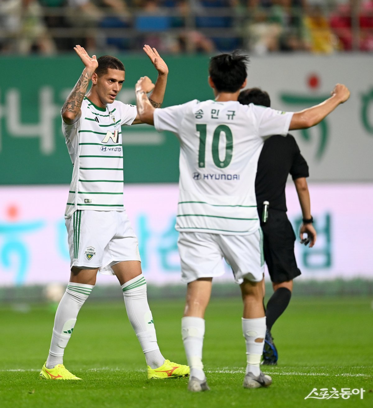 7일 대전월드컵경기장에서 열린 프로축구 ‘하나은행 K리그1 2024’ 대전 대 전북 경기에서 전북 티아고가 팀의 2번째 골을 성공시킨 후 기뻐하고 있다. 대전|김종원 기자 won@donga.com