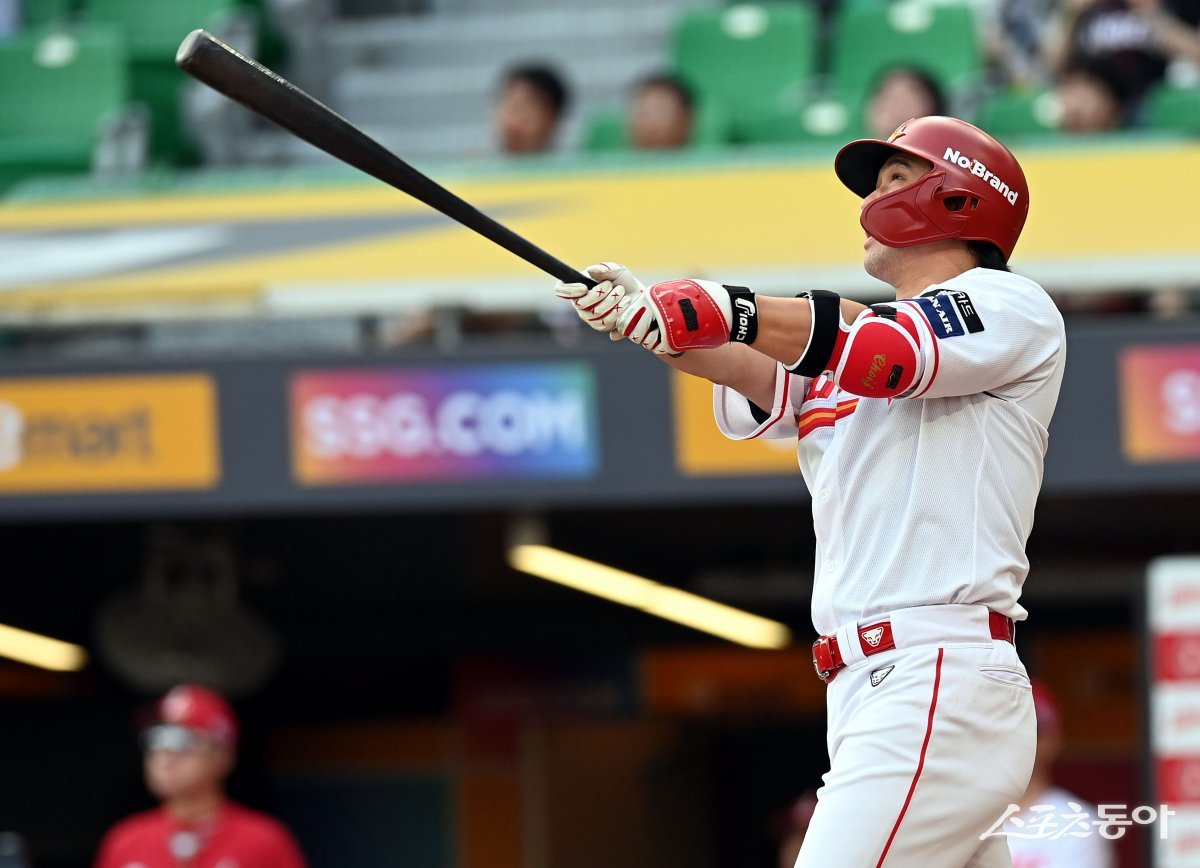 최정은 4-0으로 앞선 6회말 2사 1·2루 찬스에서도 값진 타점을 추가했다. 롯데 바뀐 투수 이민석의 바깥쪽 슬라이더를 정확하게 밀어 쳐 1타점 우전적시타를 빼앗았다. 5-0까지 점수차를 벌리는 영양가 만점의 적시타였다. 이로써 개인통산 4079루타까지 기록을 늘렸다.
