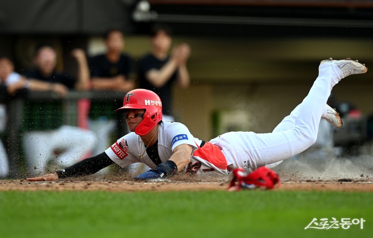 14일 광주기아챔피언스필드에서 ‘2024 신한 SOL 뱅크 KBO리그’ KIA 타이거즈와 SSG 랜더스의 경기가 열렸다. 3회말 무사 3루에서 내야땅볼 때 KIA 박찬호가 상대실책을 틈타 역전 득점을 올리고 있다. 광주 | 김민성 기자 marineboy@donga.com