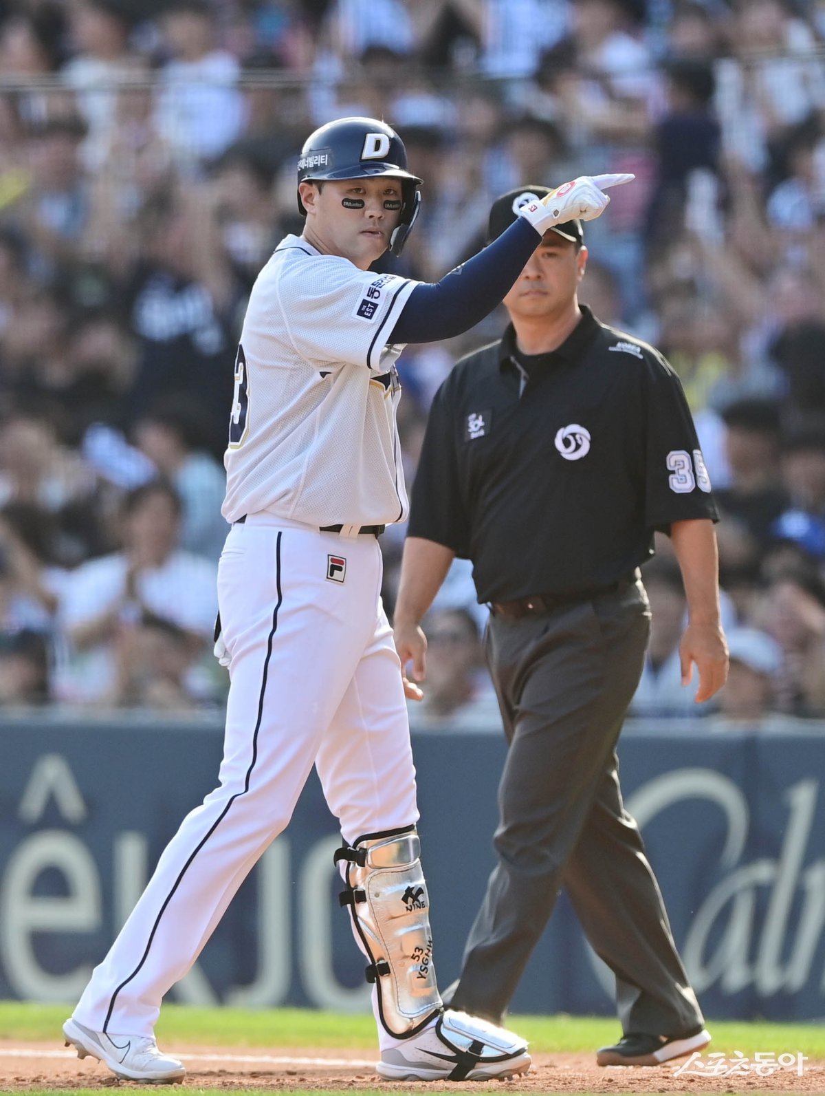 14일 서울 잠실야구장에서 열린 ‘2024 신한 SOL 뱅크 KBO리그’ 삼성 라이온즈와 두산 베어스의 경기에서 2회말 1사 2루 두산 양석환이 선제 1타점 우전 적시타를 친 후 세리머니를 하고 있다. 잠실 | 주현희 기자 teth1147@donga.com