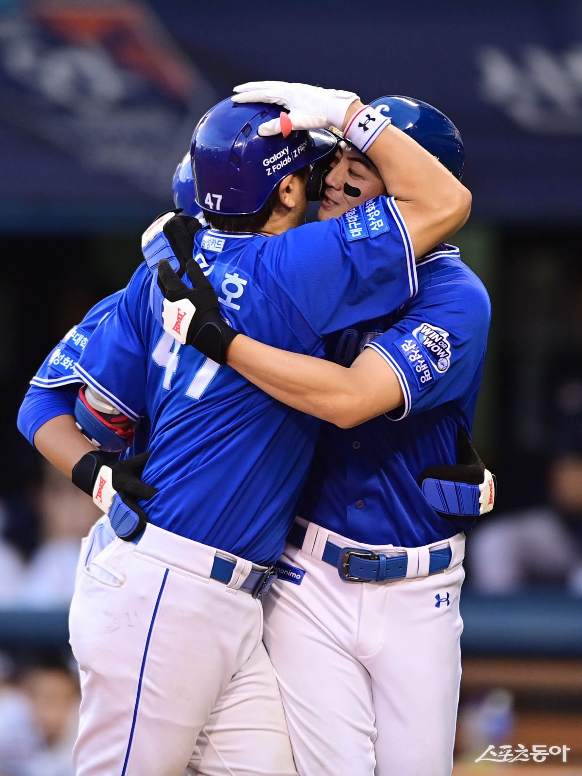 14일 서울 잠실야구장에서 열린 ‘2024 신한 SOL 뱅크 KBO리그’ 삼성 라이온즈와 두산 베어스의 경기에서 7회초 2사 1, 2루 삼성 강민호가 좌월 3점 홈런을 친 후 1루주자 구자욱과 기쁨을 나누고 있다. 잠실 | 주현희 기자 teth1147@donga.com