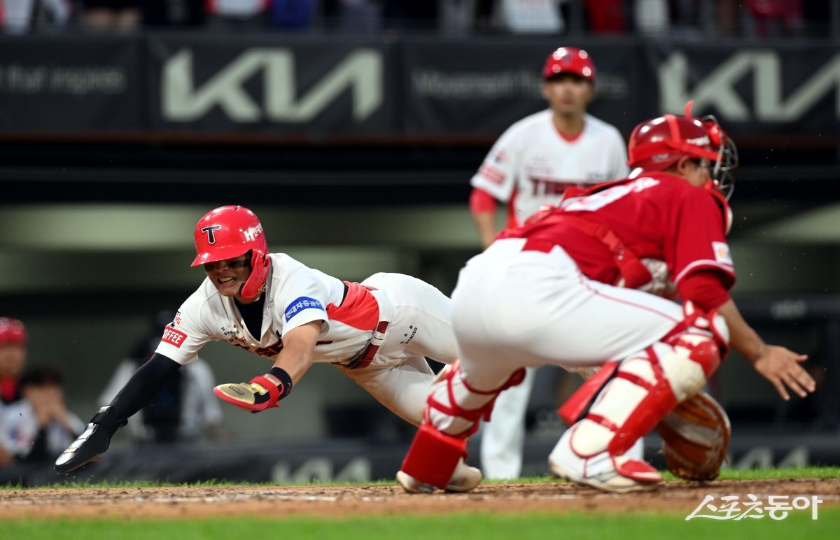 14일 광주기아챔피언스필드에서 ‘2024 신한 SOL 뱅크 KBO리그’ KIA 타이거즈와 SSG 랜더스의 경기가 열렸다. 7회말 1사 1루에서 2루타 때 KIA 1루주자 박찬호가 득점을 올리고 있다. 광주 | 김민성 기자 marineboy@donga.com