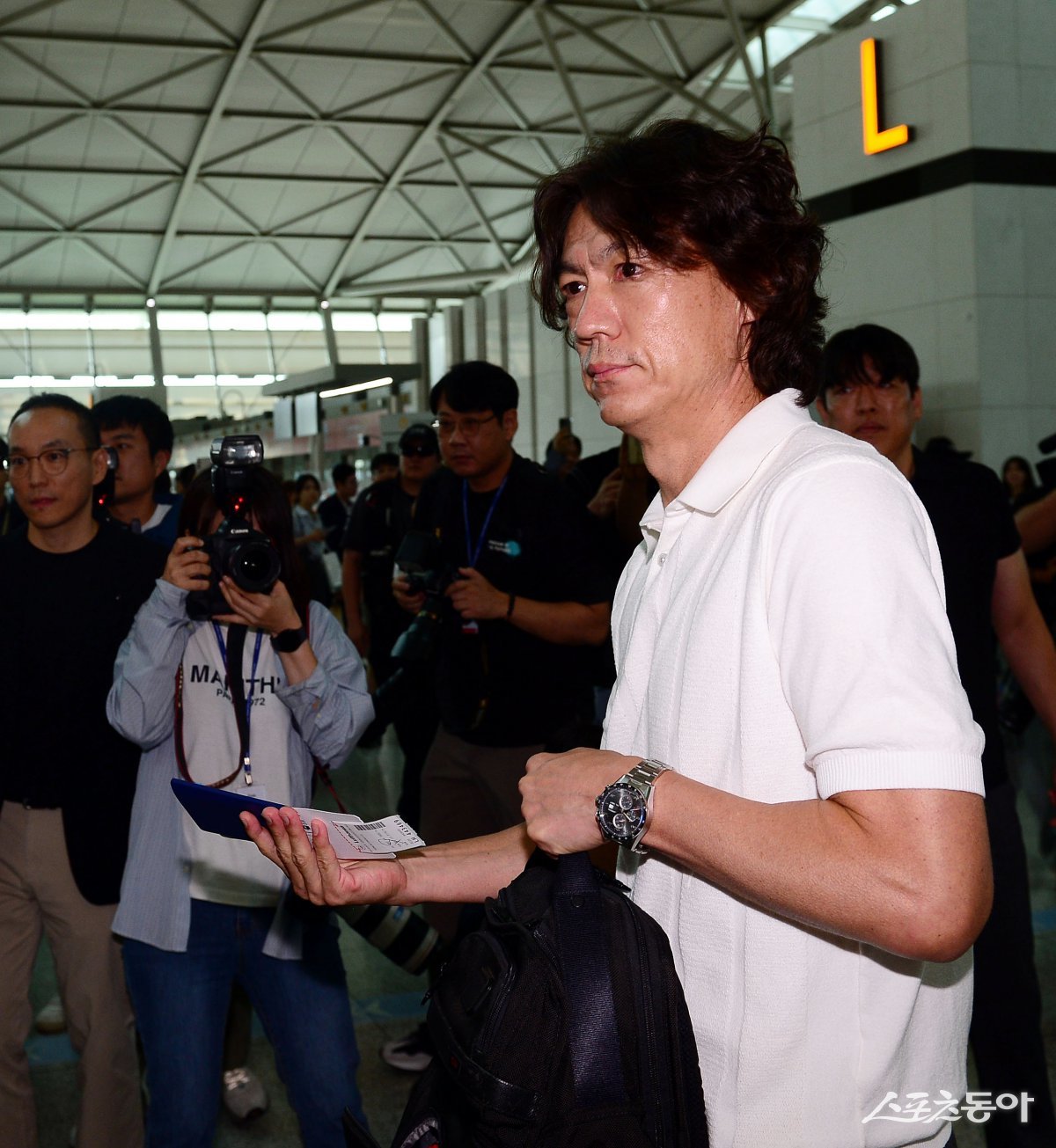 한국 축구국가대표팀의 새 사령탑으로 선임된 홍명보 감독이 외국인 코칭스태프 선임 관련 업무를 하기 위해 15일 인천국제공항을 통해 유럽으로 출국하고 있다. 인천국제공항 | 김민성 기자 marineboy@donga.com
