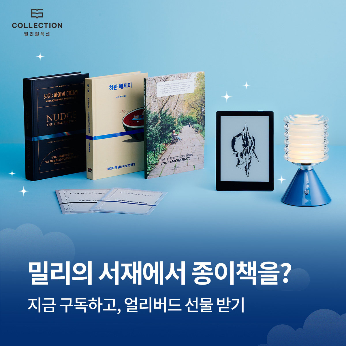 밀리 컬렉션은 ‘블루에디션’과 ‘블랙 에디션’ 두 종류로 구성된다. 블루 에디션은 에세이, 소설, 시 등 트렌디하고 가볍게 읽기 좋은 도서를, 블랙 에디션은 인문, 과학, 자기 계발 등 뉴 클래식 장르를 다룬다. 매월 각 에디션에서 1종씩 총 2종의도서가 출시되며, 구독자는 두 에디션의 도서 중 자신의 취향에 맞는1종을 선택할 수 있다.