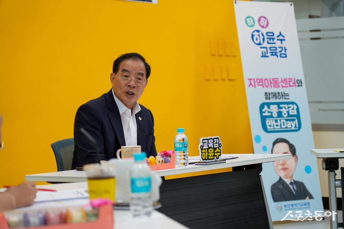 하윤수 교육감이 15일 시교육청에서 ‘지역아동센터와 함께하는 소통·공감 만난 Day’ 행사에서 발언하고 있다. (사진제공=부산시교육청)