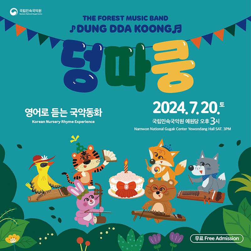 국립민속국악원(원장 김중현)은 20일 오후 3시부터 국립민속국악원 예원당에서 국악기 체험과 영어로 노래하며 듣는 국악동화 ‘숲속음악대 덩따쿵’을 진행한다.