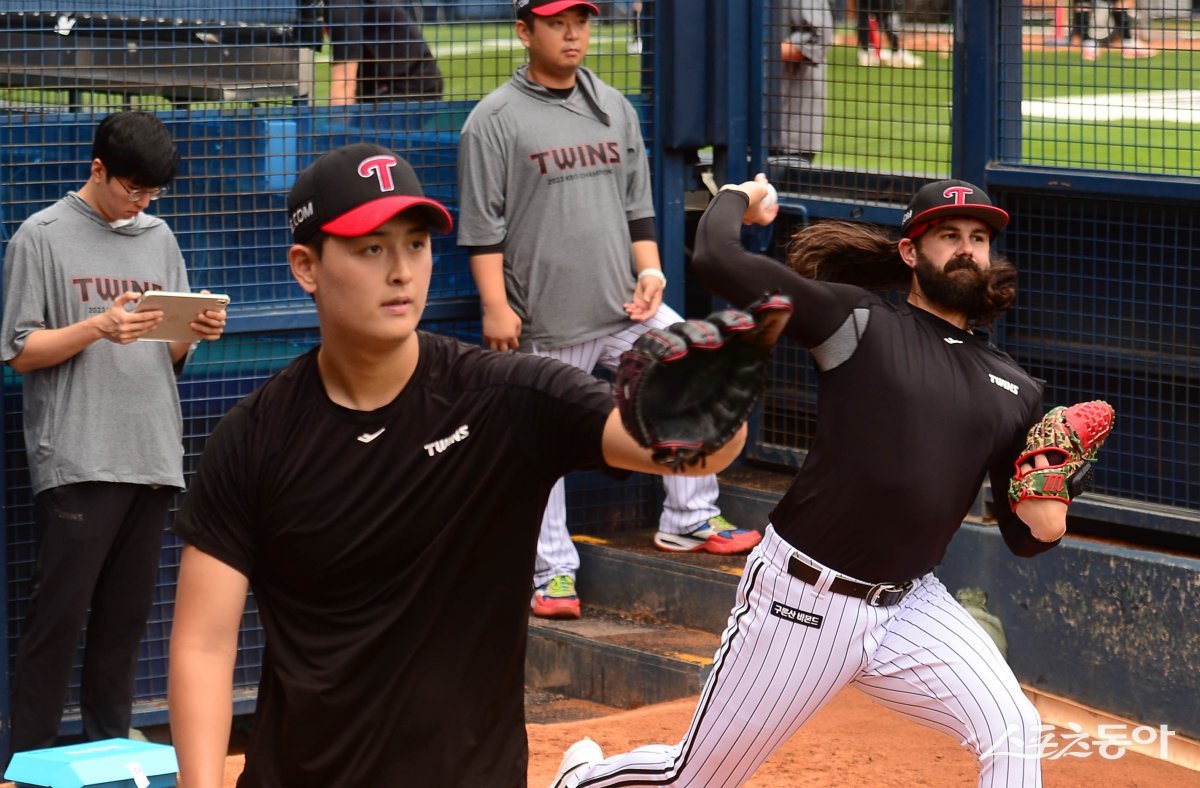 17일 서울 잠실야구장에서 열린 ‘2024 신한 SOL 뱅크 KBO리그’ SSG 랜더스와 LG 트윈스의 경기에 앞서 LG 켈리가 불펜 피칭을 하고 있다. 잠실 | 주현희 기자 teth1147@donga.com