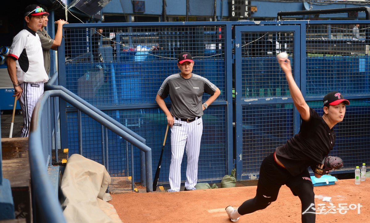 17일 서울 잠실야구장에서 열린 ‘2024 신한 SOL 뱅크 KBO리그’ SSG 랜더스와 LG 트윈스의 경기에 앞서 LG 염경엽 감독과 최상덕 코치가 허용주의 불펜 피칭을 지켜보고 있다. 잠실 | 주현희 기자 teth1147@donga.com