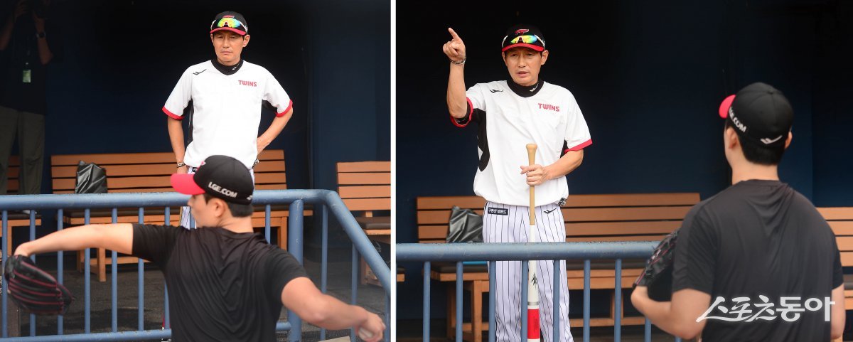 17일 서울 잠실야구장에서 열린 ‘2024 신한 SOL 뱅크 KBO리그’ SSG 랜더스와 LG 트윈스의 경기에 앞서 LG 염경엽 감독이 허용주의 불펜 피칭을 지켜보고 있다. 잠실 | 주현희 기자 teth1147@donga.com